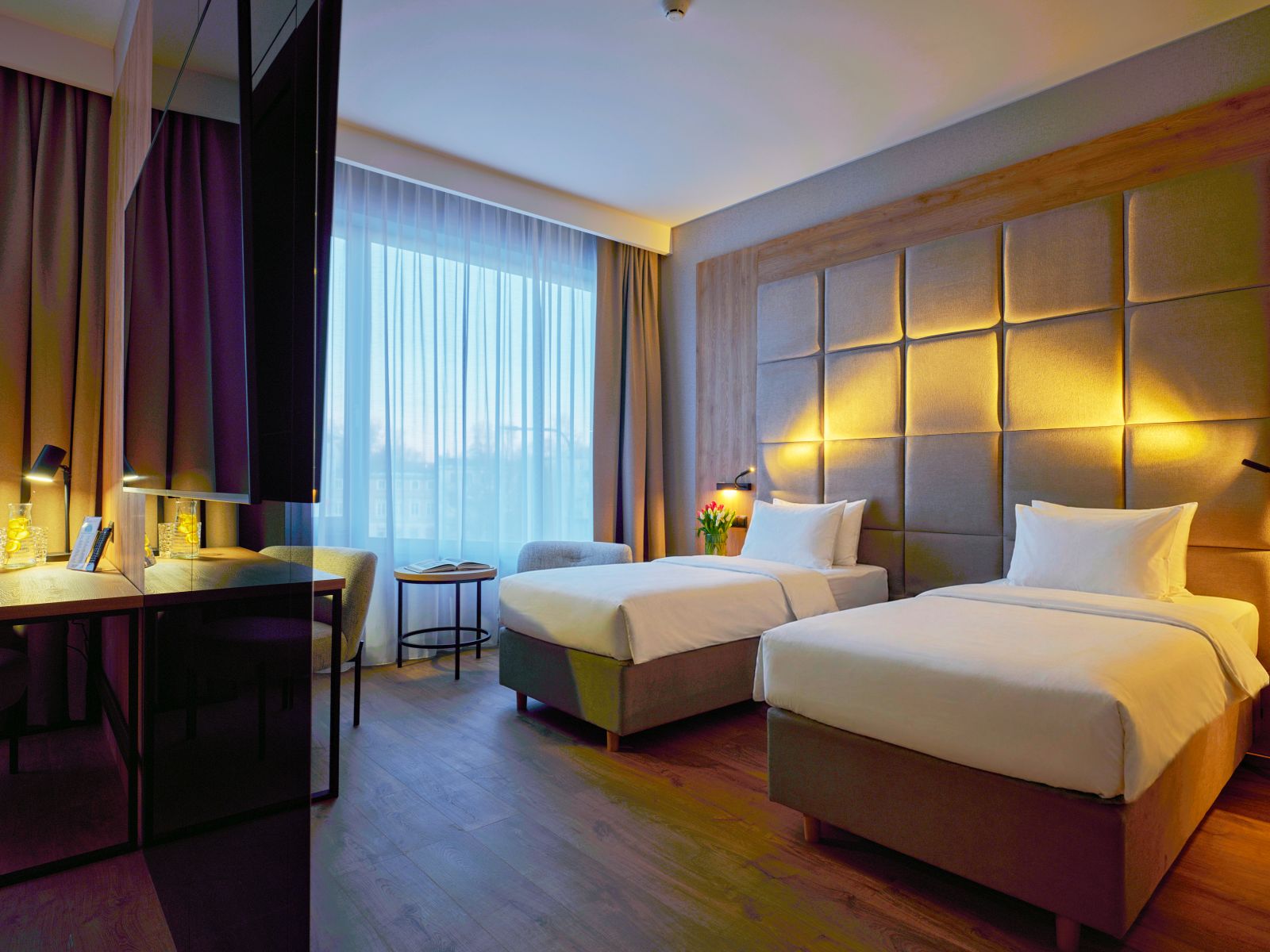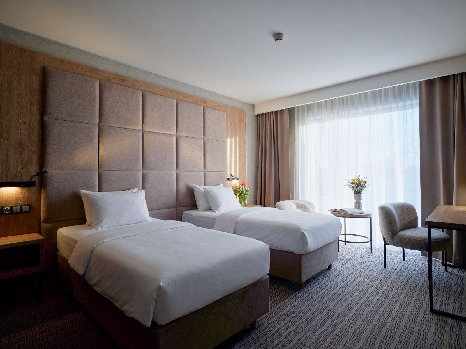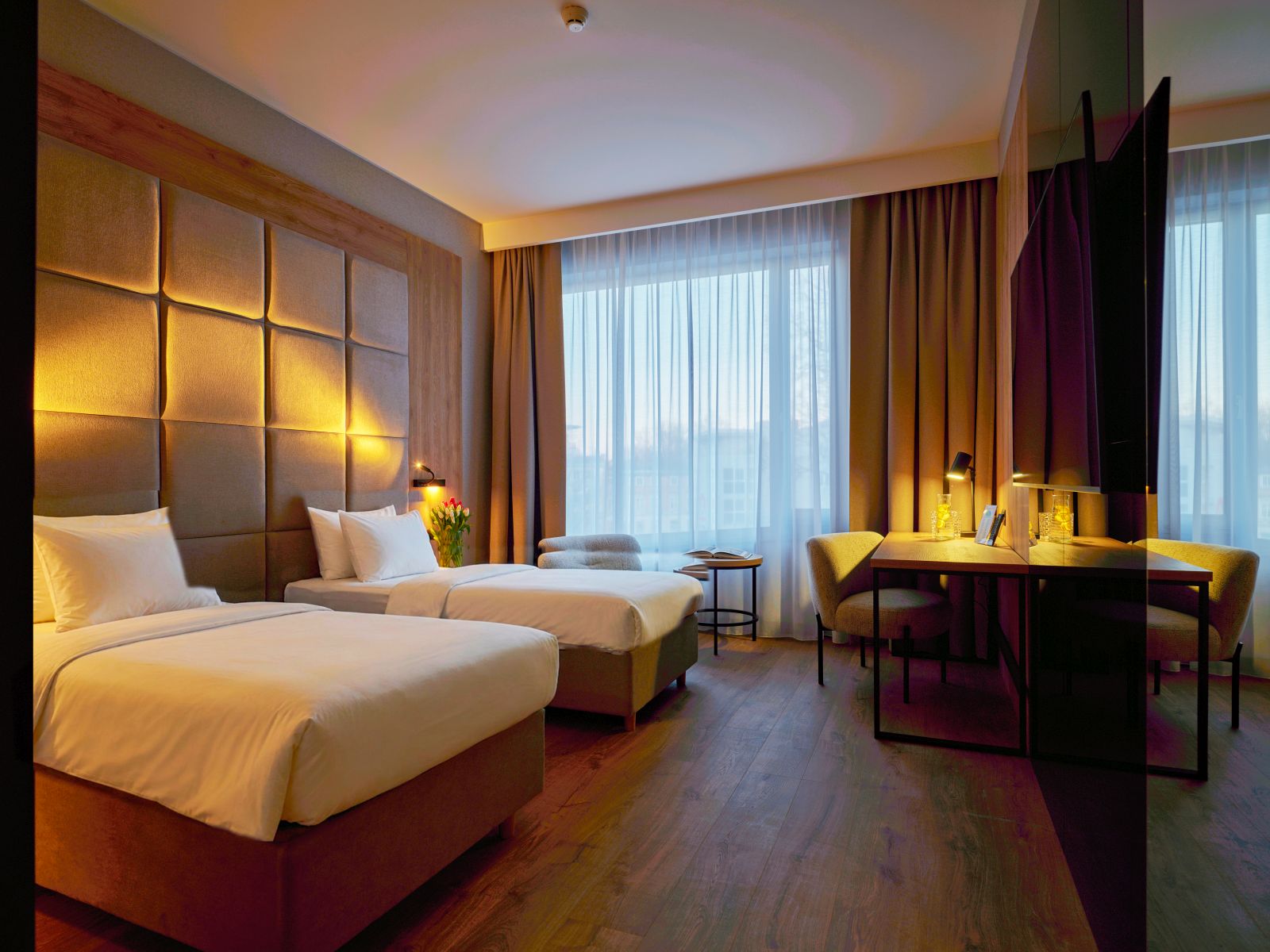który łączy nowoczesne wnętrze z przytulną atmosferą. Idealny zarówno dla gości biznesowych, jak i turystycznych. W pokoju znajduje się wygodne łóżko, funkcjonalne miejsce do pracy, prywatna łazienka oraz bezpłatne Wi-Fi. To idealna przestrzeń na relaks po intensywnym dniu.